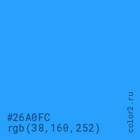 Цвет #26A0FC в цветовой модели RGB обозначается тремя октетами (38, 160, 252) в десятичном формате и #26A0FC в шестнадцатиричном (hex) формате, которые являются интенсивностью красного 38 (hex 26), интенсивность зелёного 160 (hex A0) и интенсивность синего 252 (hex FC).