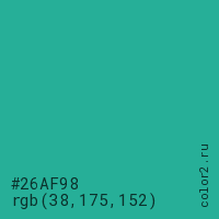 Цвет #26AF98 в цветовой модели RGB обозначается тремя октетами (38, 175, 152) в десятичном формате и #26AF98 в шестнадцатиричном (hex) формате, которые являются интенсивностью красного 38 (hex 26), интенсивность зелёного 175 (hex AF) и интенсивность синего 152 (hex 98).