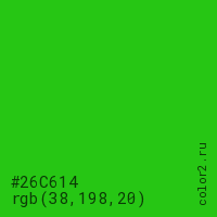 Цвет #26C614 в цветовой модели RGB обозначается тремя октетами (38, 198, 20) в десятичном формате и #26C614 в шестнадцатиричном (hex) формате, которые являются интенсивностью красного 38 (hex 26), интенсивность зелёного 198 (hex C6) и интенсивность синего 20 (hex 14).