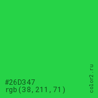 Цвет #26D347 в цветовой модели RGB обозначается тремя октетами (38, 211, 71) в десятичном формате и #26D347 в шестнадцатиричном (hex) формате, которые являются интенсивностью красного 38 (hex 26), интенсивность зелёного 211 (hex D3) и интенсивность синего 71 (hex 47).