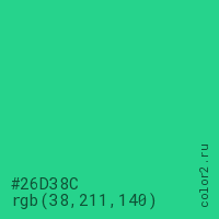 Цвет #26D38C в цветовой модели RGB обозначается тремя октетами (38, 211, 140) в десятичном формате и #26D38C в шестнадцатиричном (hex) формате, которые являются интенсивностью красного 38 (hex 26), интенсивность зелёного 211 (hex D3) и интенсивность синего 140 (hex 8C).