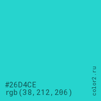 Цвет #26D4CE в цветовой модели RGB обозначается тремя октетами (38, 212, 206) в десятичном формате и #26D4CE в шестнадцатиричном (hex) формате, которые являются интенсивностью красного 38 (hex 26), интенсивность зелёного 212 (hex D4) и интенсивность синего 206 (hex CE).
