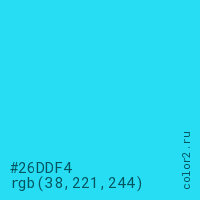 Цвет #26DDF4 в цветовой модели RGB обозначается тремя октетами (38, 221, 244) в десятичном формате и #26DDF4 в шестнадцатиричном (hex) формате, которые являются интенсивностью красного 38 (hex 26), интенсивность зелёного 221 (hex DD) и интенсивность синего 244 (hex F4).