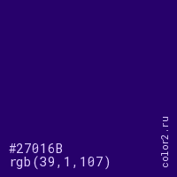 Цвет #27016B в цветовой модели RGB обозначается тремя октетами (39, 1, 107) в десятичном формате и #27016B в шестнадцатиричном (hex) формате, которые являются интенсивностью красного 39 (hex 27), интенсивность зелёного 1 (hex 01) и интенсивность синего 107 (hex 6B).