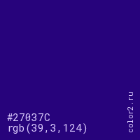 Цвет #27037C в цветовой модели RGB обозначается тремя октетами (39, 3, 124) в десятичном формате и #27037C в шестнадцатиричном (hex) формате, которые являются интенсивностью красного 39 (hex 27), интенсивность зелёного 3 (hex 03) и интенсивность синего 124 (hex 7C).