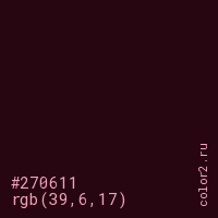 Цвет #270611 в цветовой модели RGB обозначается тремя октетами (39, 6, 17) в десятичном формате и #270611 в шестнадцатиричном (hex) формате, которые являются интенсивностью красного 39 (hex 27), интенсивность зелёного 6 (hex 06) и интенсивность синего 17 (hex 11).