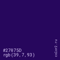 Цвет #27075D в цветовой модели RGB обозначается тремя октетами (39, 7, 93) в десятичном формате и #27075D в шестнадцатиричном (hex) формате, которые являются интенсивностью красного 39 (hex 27), интенсивность зелёного 7 (hex 07) и интенсивность синего 93 (hex 5D).