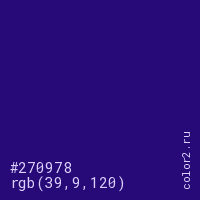 Цвет #270978 в цветовой модели RGB обозначается тремя октетами (39, 9, 120) в десятичном формате и #270978 в шестнадцатиричном (hex) формате, которые являются интенсивностью красного 39 (hex 27), интенсивность зелёного 9 (hex 09) и интенсивность синего 120 (hex 78).