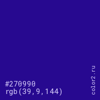 Цвет #270990 в цветовой модели RGB обозначается тремя октетами (39, 9, 144) в десятичном формате и #270990 в шестнадцатиричном (hex) формате, которые являются интенсивностью красного 39 (hex 27), интенсивность зелёного 9 (hex 09) и интенсивность синего 144 (hex 90).