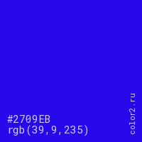 Цвет #2709EB в цветовой модели RGB обозначается тремя октетами (39, 9, 235) в десятичном формате и #2709EB в шестнадцатиричном (hex) формате, которые являются интенсивностью красного 39 (hex 27), интенсивность зелёного 9 (hex 09) и интенсивность синего 235 (hex EB).