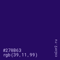 Цвет #270B63 в цветовой модели RGB обозначается тремя октетами (39, 11, 99) в десятичном формате и #270B63 в шестнадцатиричном (hex) формате, которые являются интенсивностью красного 39 (hex 27), интенсивность зелёного 11 (hex 0B) и интенсивность синего 99 (hex 63).