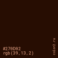 Цвет #270D02 в цветовой модели RGB обозначается тремя октетами (39, 13, 2) в десятичном формате и #270D02 в шестнадцатиричном (hex) формате, которые являются интенсивностью красного 39 (hex 27), интенсивность зелёного 13 (hex 0D) и интенсивность синего 2 (hex 02).