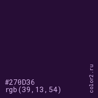 Цвет #270D36 в цветовой модели RGB обозначается тремя октетами (39, 13, 54) в десятичном формате и #270D36 в шестнадцатиричном (hex) формате, которые являются интенсивностью красного 39 (hex 27), интенсивность зелёного 13 (hex 0D) и интенсивность синего 54 (hex 36).