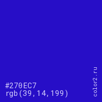Цвет #270EC7 в цветовой модели RGB обозначается тремя октетами (39, 14, 199) в десятичном формате и #270EC7 в шестнадцатиричном (hex) формате, которые являются интенсивностью красного 39 (hex 27), интенсивность зелёного 14 (hex 0E) и интенсивность синего 199 (hex C7).