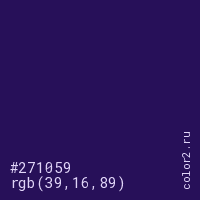 Цвет #271059 в цветовой модели RGB обозначается тремя октетами (39, 16, 89) в десятичном формате и #271059 в шестнадцатиричном (hex) формате, которые являются интенсивностью красного 39 (hex 27), интенсивность зелёного 16 (hex 10) и интенсивность синего 89 (hex 59).