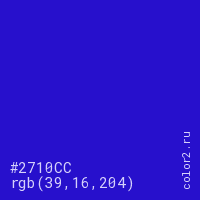 Цвет #2710CC в цветовой модели RGB обозначается тремя октетами (39, 16, 204) в десятичном формате и #2710CC в шестнадцатиричном (hex) формате, которые являются интенсивностью красного 39 (hex 27), интенсивность зелёного 16 (hex 10) и интенсивность синего 204 (hex CC).