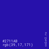 Цвет #2711AB в цветовой модели RGB обозначается тремя октетами (39, 17, 171) в десятичном формате и #2711AB в шестнадцатиричном (hex) формате, которые являются интенсивностью красного 39 (hex 27), интенсивность зелёного 17 (hex 11) и интенсивность синего 171 (hex AB).