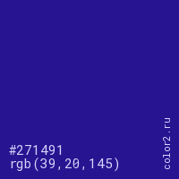 Цвет #271491 в цветовой модели RGB обозначается тремя октетами (39, 20, 145) в десятичном формате и #271491 в шестнадцатиричном (hex) формате, которые являются интенсивностью красного 39 (hex 27), интенсивность зелёного 20 (hex 14) и интенсивность синего 145 (hex 91).
