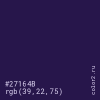 Цвет #27164B в цветовой модели RGB обозначается тремя октетами (39, 22, 75) в десятичном формате и #27164B в шестнадцатиричном (hex) формате, которые являются интенсивностью красного 39 (hex 27), интенсивность зелёного 22 (hex 16) и интенсивность синего 75 (hex 4B).