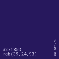 Цвет #27185D в цветовой модели RGB обозначается тремя октетами (39, 24, 93) в десятичном формате и #27185D в шестнадцатиричном (hex) формате, которые являются интенсивностью красного 39 (hex 27), интенсивность зелёного 24 (hex 18) и интенсивность синего 93 (hex 5D).
