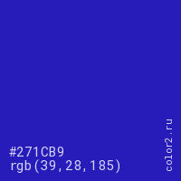 Цвет #271CB9 в цветовой модели RGB обозначается тремя октетами (39, 28, 185) в десятичном формате и #271CB9 в шестнадцатиричном (hex) формате, которые являются интенсивностью красного 39 (hex 27), интенсивность зелёного 28 (hex 1C) и интенсивность синего 185 (hex B9).