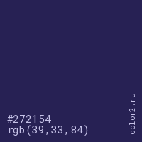 Цвет #272154 в цветовой модели RGB обозначается тремя октетами (39, 33, 84) в десятичном формате и #272154 в шестнадцатиричном (hex) формате, которые являются интенсивностью красного 39 (hex 27), интенсивность зелёного 33 (hex 21) и интенсивность синего 84 (hex 54).