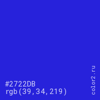 Цвет #2722DB в цветовой модели RGB обозначается тремя октетами (39, 34, 219) в десятичном формате и #2722DB в шестнадцатиричном (hex) формате, которые являются интенсивностью красного 39 (hex 27), интенсивность зелёного 34 (hex 22) и интенсивность синего 219 (hex DB).