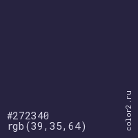 Цвет #272340 в цветовой модели RGB обозначается тремя октетами (39, 35, 64) в десятичном формате и #272340 в шестнадцатиричном (hex) формате, которые являются интенсивностью красного 39 (hex 27), интенсивность зелёного 35 (hex 23) и интенсивность синего 64 (hex 40).