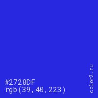 Цвет #2728DF в цветовой модели RGB обозначается тремя октетами (39, 40, 223) в десятичном формате и #2728DF в шестнадцатиричном (hex) формате, которые являются интенсивностью красного 39 (hex 27), интенсивность зелёного 40 (hex 28) и интенсивность синего 223 (hex DF).