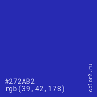 Цвет #272AB2 в цветовой модели RGB обозначается тремя октетами (39, 42, 178) в десятичном формате и #272AB2 в шестнадцатиричном (hex) формате, которые являются интенсивностью красного 39 (hex 27), интенсивность зелёного 42 (hex 2A) и интенсивность синего 178 (hex B2).