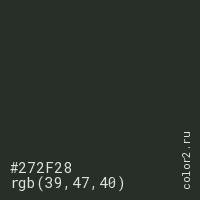 Цвет #272F28 в цветовой модели RGB обозначается тремя октетами (39, 47, 40) в десятичном формате и #272F28 в шестнадцатиричном (hex) формате, которые являются интенсивностью красного 39 (hex 27), интенсивность зелёного 47 (hex 2F) и интенсивность синего 40 (hex 28).