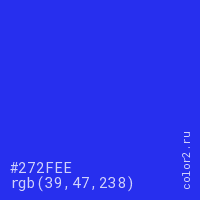 Цвет #272FEE в цветовой модели RGB обозначается тремя октетами (39, 47, 238) в десятичном формате и #272FEE в шестнадцатиричном (hex) формате, которые являются интенсивностью красного 39 (hex 27), интенсивность зелёного 47 (hex 2F) и интенсивность синего 238 (hex EE).