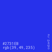 Цвет #2731EB в цветовой модели RGB обозначается тремя октетами (39, 49, 235) в десятичном формате и #2731EB в шестнадцатиричном (hex) формате, которые являются интенсивностью красного 39 (hex 27), интенсивность зелёного 49 (hex 31) и интенсивность синего 235 (hex EB).