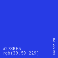 Цвет #273BE5 в цветовой модели RGB обозначается тремя октетами (39, 59, 229) в десятичном формате и #273BE5 в шестнадцатиричном (hex) формате, которые являются интенсивностью красного 39 (hex 27), интенсивность зелёного 59 (hex 3B) и интенсивность синего 229 (hex E5).