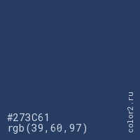 Цвет #273C61 в цветовой модели RGB обозначается тремя октетами (39, 60, 97) в десятичном формате и #273C61 в шестнадцатиричном (hex) формате, которые являются интенсивностью красного 39 (hex 27), интенсивность зелёного 60 (hex 3C) и интенсивность синего 97 (hex 61).