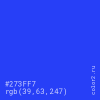 Цвет #273FF7 в цветовой модели RGB обозначается тремя октетами (39, 63, 247) в десятичном формате и #273FF7 в шестнадцатиричном (hex) формате, которые являются интенсивностью красного 39 (hex 27), интенсивность зелёного 63 (hex 3F) и интенсивность синего 247 (hex F7).