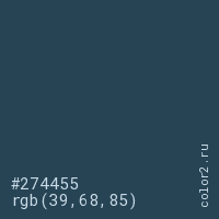 Цвет #274455 в цветовой модели RGB обозначается тремя октетами (39, 68, 85) в десятичном формате и #274455 в шестнадцатиричном (hex) формате, которые являются интенсивностью красного 39 (hex 27), интенсивность зелёного 68 (hex 44) и интенсивность синего 85 (hex 55).