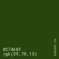 Цвет #27460F в цветовой модели RGB обозначается тремя октетами (39, 70, 15) в десятичном формате и #27460F в шестнадцатиричном (hex) формате, которые являются интенсивностью красного 39 (hex 27), интенсивность зелёного 70 (hex 46) и интенсивность синего 15 (hex 0F).