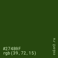 Цвет #27480F в цветовой модели RGB обозначается тремя октетами (39, 72, 15) в десятичном формате и #27480F в шестнадцатиричном (hex) формате, которые являются интенсивностью красного 39 (hex 27), интенсивность зелёного 72 (hex 48) и интенсивность синего 15 (hex 0F).