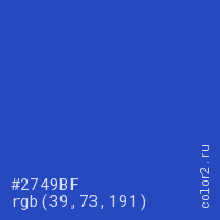 Цвет #2749BF в цветовой модели RGB обозначается тремя октетами (39, 73, 191) в десятичном формате и #2749BF в шестнадцатиричном (hex) формате, которые являются интенсивностью красного 39 (hex 27), интенсивность зелёного 73 (hex 49) и интенсивность синего 191 (hex BF).