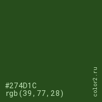 Цвет #274D1C в цветовой модели RGB обозначается тремя октетами (39, 77, 28) в десятичном формате и #274D1C в шестнадцатиричном (hex) формате, которые являются интенсивностью красного 39 (hex 27), интенсивность зелёного 77 (hex 4D) и интенсивность синего 28 (hex 1C).