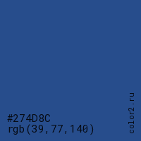 Цвет #274D8C в цветовой модели RGB обозначается тремя октетами (39, 77, 140) в десятичном формате и #274D8C в шестнадцатиричном (hex) формате, которые являются интенсивностью красного 39 (hex 27), интенсивность зелёного 77 (hex 4D) и интенсивность синего 140 (hex 8C).