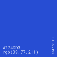 Цвет #274DD3 в цветовой модели RGB обозначается тремя октетами (39, 77, 211) в десятичном формате и #274DD3 в шестнадцатиричном (hex) формате, которые являются интенсивностью красного 39 (hex 27), интенсивность зелёного 77 (hex 4D) и интенсивность синего 211 (hex D3).