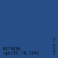Цвет #274E86 в цветовой модели RGB обозначается тремя октетами (39, 78, 134) в десятичном формате и #274E86 в шестнадцатиричном (hex) формате, которые являются интенсивностью красного 39 (hex 27), интенсивность зелёного 78 (hex 4E) и интенсивность синего 134 (hex 86).