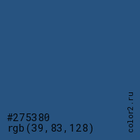 Цвет #275380 в цветовой модели RGB обозначается тремя октетами (39, 83, 128) в десятичном формате и #275380 в шестнадцатиричном (hex) формате, которые являются интенсивностью красного 39 (hex 27), интенсивность зелёного 83 (hex 53) и интенсивность синего 128 (hex 80).