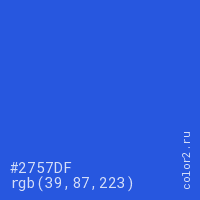Цвет #2757DF в цветовой модели RGB обозначается тремя октетами (39, 87, 223) в десятичном формате и #2757DF в шестнадцатиричном (hex) формате, которые являются интенсивностью красного 39 (hex 27), интенсивность зелёного 87 (hex 57) и интенсивность синего 223 (hex DF).