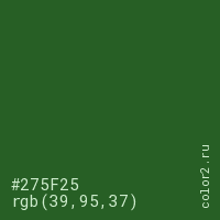 Цвет #275F25 в цветовой модели RGB обозначается тремя октетами (39, 95, 37) в десятичном формате и #275F25 в шестнадцатиричном (hex) формате, которые являются интенсивностью красного 39 (hex 27), интенсивность зелёного 95 (hex 5F) и интенсивность синего 37 (hex 25).