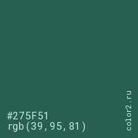 Цвет #275F51 в цветовой модели RGB обозначается тремя октетами (39, 95, 81) в десятичном формате и #275F51 в шестнадцатиричном (hex) формате, которые являются интенсивностью красного 39 (hex 27), интенсивность зелёного 95 (hex 5F) и интенсивность синего 81 (hex 51).
