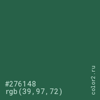 Цвет #276148 в цветовой модели RGB обозначается тремя октетами (39, 97, 72) в десятичном формате и #276148 в шестнадцатиричном (hex) формате, которые являются интенсивностью красного 39 (hex 27), интенсивность зелёного 97 (hex 61) и интенсивность синего 72 (hex 48).