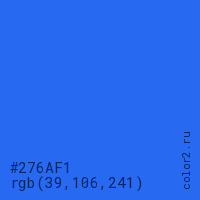 Цвет #276AF1 в цветовой модели RGB обозначается тремя октетами (39, 106, 241) в десятичном формате и #276AF1 в шестнадцатиричном (hex) формате, которые являются интенсивностью красного 39 (hex 27), интенсивность зелёного 106 (hex 6A) и интенсивность синего 241 (hex F1).